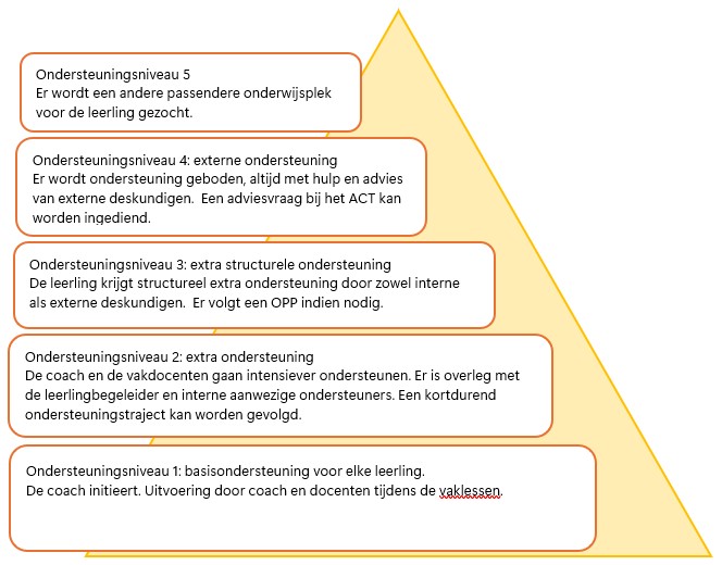 Op het Willem van Oranje College werken we met 5 verschillende niveaus van ondersteuning. Deze zijn samengevat in de afbeelding hieronder.